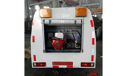 該車輛型號(hào)CLW5020GQXC4,選用的是解放汽油機(jī)底盤2.75米軸距,清洗水箱的容積1.2立方米。車輛前端有一排帶有10個(gè)高壓沖頭前沖器,車子選配意大利進(jìn)口的高壓泵,壓力達(dá)到10兆帕,該車是用于清洗路面,路面的保潔養(yǎng)護(hù),比如臨街餐飲路面上的油漬,城區(qū)路面因轉(zhuǎn)運(yùn)泥土車的撒漏使泥土粘貼在路面上,以及其他較強(qiáng)力的路面附著物的清洗處理都需要使用該車,除污效果好,省時(shí)省力。