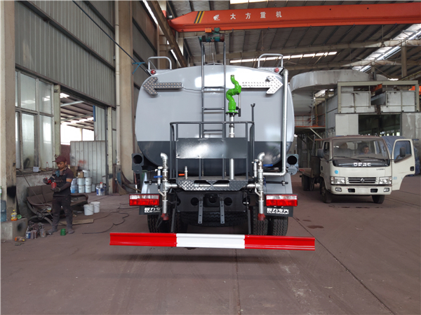 湖北武漢灑水車前裝有鴨嘴型噴霧或圓頭沖嘴,后面裝有圓柱形灑水砣,側(cè)噴花灑蓮花頭,車后部裝有高射噴槍。