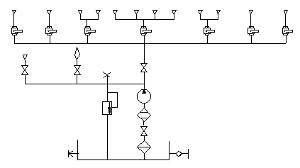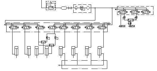 氣動系統(tǒng)從底盤貯氣筒取得氣源,工作壓力≮0.6Mpa。根據(jù)不同的作業(yè)要求,由電磁閥控制各個(gè)氣缸實(shí)現(xiàn)不同的動力組合。