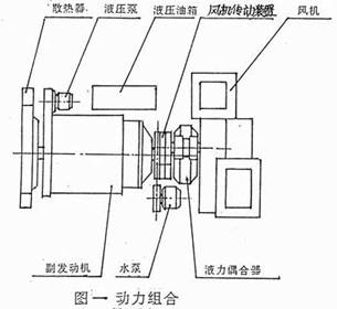 動力組合由散熱器、副發(fā)動機(jī)、液力偶合器、皮帶傳動裝置、風(fēng)機(jī)組成。為清掃作業(yè)提供動力源。動力組合通過副框架固定在底盤大梁上。