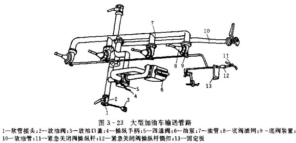 加油車為了具備給受油設(shè)備加油、自吸裝油、循環(huán)攪油,移動泵站作用,吸回加油軟管中的油液等五種功能,輸油管路也較運油汽車復(fù)雜,并設(shè)有油泵。圖3-23是一大型加油車的管路系統(tǒng)。該車有四個艙, 每個艙底都裝有一個底閥裝置(見圖3-24),并且為放油方便,在汽車左、右兩側(cè)及尾部各設(shè)置一個放油閥,以便適應(yīng)車輛在不同方位上時進行加油作業(yè)。