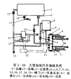?。?)油路系統(tǒng)要求與組成,根據(jù)加油車實際性能要求,通常是按上述的加油車五種功能,確定一個最佳油路系統(tǒng),滿足作業(yè)需要,并力求結(jié)構(gòu)簡單,工作可靠,工芤性良好,容易實現(xiàn)“三化”,管路較短?,F(xiàn)以圖3-28大型加油車的油路系統(tǒng)為例,介紹設(shè)計中需注意的一些問題。該車的加油管中有閥16、油泵15、球閥7、過濾器3、流量計11、球閥5和10、絞盤總成8及加油槍等。油液是經(jīng)過濾并計量后給受油容器加油的。為防止系統(tǒng)壓力超過規(guī)定值,在油