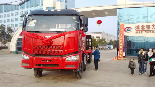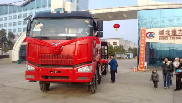 該車于年前客戶定購,于今天昨日交付給客戶,因為在客戶在我公司辦理分期付款業(yè)務(wù),在我市上戶,年檢也在我市,客戶對我們說:“其實上我市的牌照還省心些,上客戶當?shù)氐呐普漳陮忂€要季審,年審,費用也需要3000多,還不如一次性交由我公司來年審,省時省心!”。今天客戶在我市辦理上牌手續(xù)及辦理營運證。于晚上客戶提車走??蛻魧@輛解放J6前四后八平板運輸車非常滿意。