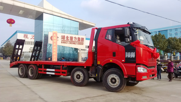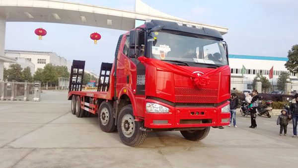 解放J6前四后八平板運輸車采用解放錫柴330EGR馬力發(fā)動機改裝,帶制動。