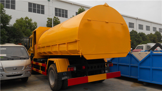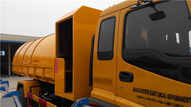 該車是尼日利亞用戶在實(shí)地考察了我廠后定購的,該車根據(jù)用戶的實(shí)際使用環(huán)境經(jīng)過了特殊設(shè)計(jì):密封垃圾箱設(shè)計(jì)成了橢圓形,便于雨水流走,另外,根據(jù)實(shí)際使用需要,在垃圾斗的前面還設(shè)計(jì)有一個(gè)乘人間,便于垃圾清運(yùn)人員的乘坐。