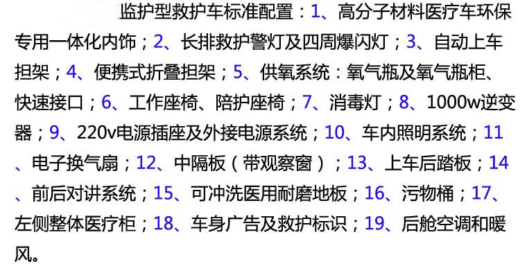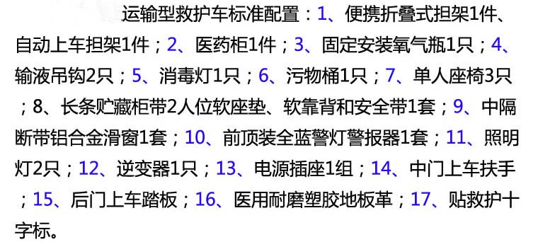 其它 1.車內(nèi)裝置藥柜、擔(dān)架、氧氣瓶、輸液掛鉤等專用裝置;2.隨底盤選裝中頂時(shí)整車高度為2490mm;隨底盤選裝高頂時(shí)整車高度為2875mm;3.ABS系統(tǒng)控制器型號:APG3550500G;ABS系統(tǒng)控制器生產(chǎn)企業(yè):浙江亞太機(jī)電股份有限公司;發(fā)動機(jī)最大凈功率83KW;4.隨底盤選裝后踏步板,對應(yīng)整車長度為5696mm,不選裝后踏步板時(shí)對應(yīng)整車長度為5496mm;隨底盤選裝輪罩蓋,選裝前霧燈,選裝黑色前大燈;6.車身可選裝爆閃燈.車頂可選裝圓柱形爆閃燈.