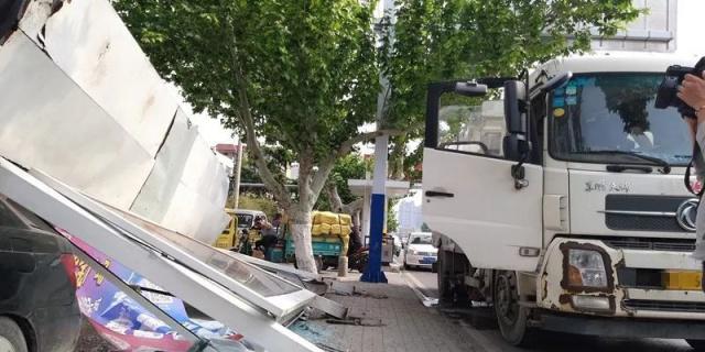 在現(xiàn)場看到,闖禍的洗掃車,停在東側(cè)的非機(jī)動車道上,而旁邊被撞的公交站臺已經(jīng)倒地,站臺棚損毀嚴(yán)重,站臺下面還砸著一輛黑色私家車。