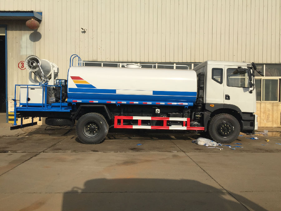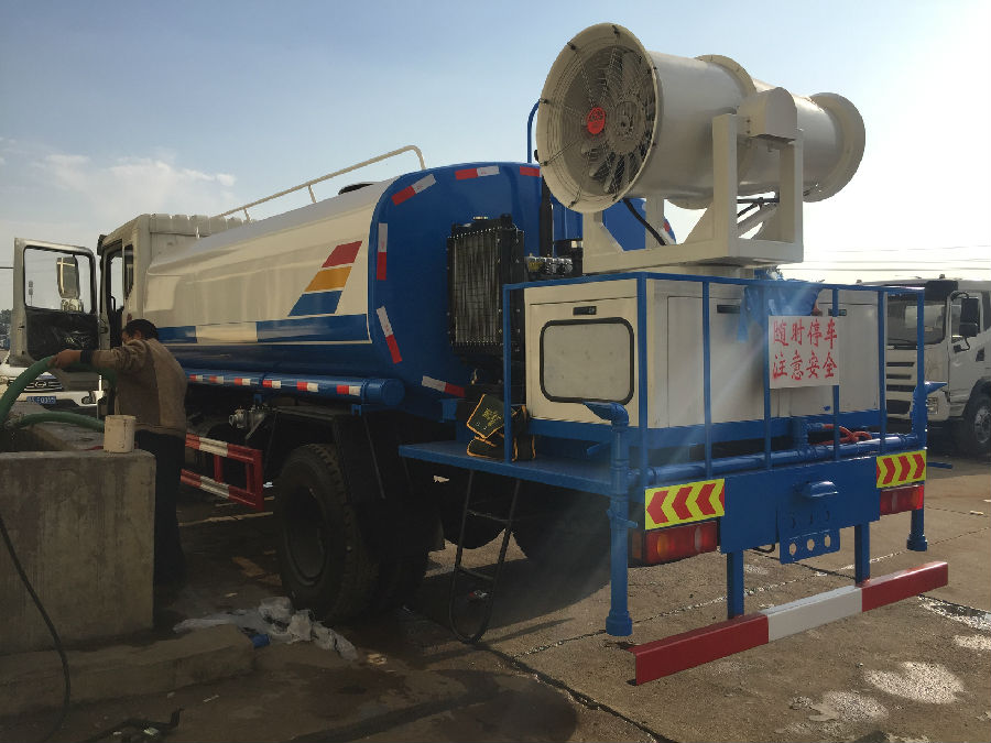 單橋可裝50-60米噴霧機車型,閃亮登場。整車型號:DLQ5180GSSL5,底盤型號EQ5180GLVJ,東風(fēng)新款T5駕駛室,4500MM軸距,國五,康機190馬力,陜齒小八檔變速箱,帶原裝ABS。前沖后灑,后工作平臺帶高炮,右位花灑,側(cè)噴。前橋5噸,后橋10噸,10.00鋼絲胎。后平臺上加裝50米霧機,水平射程50--55米,發(fā)電機組30KW,風(fēng)機電機11KW,水泵電機3KW。