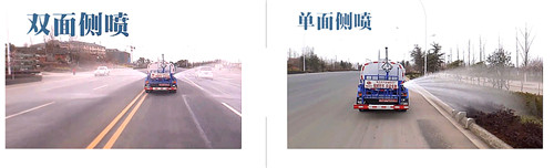 灑水車前裝有鴨形噴嘴或圓頭沖嘴,后面裝有圓柱開灑水噴嘴或蓮蓬頭噴嘴,后部有一工作平臺,裝配有水炮。后部還可裝8個噴嘴(選裝)噴水器一般用于沖洗街道,起除塵和降溫作用,其噴水器可以用調(diào)節(jié)噴嘴螺紋的方法改變噴水器的噴灑方向和角度,高射水炮可以用于城鄉(xiāng)園林綠化及應急消防。蓮蓬嘴可以澆落路中間噴水器沖起的灰塵,起到清潔空氣的作用。