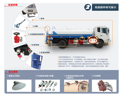 上裝配置:采用CH1035AQ24底盤改裝,水箱容積2立方,前沖后灑,側(cè)噴,罐體后帶工作平臺,平臺上安裝綠化灑水炮,灑水炮可全方位旋轉(zhuǎn),可連續(xù)調(diào)成直沖狀、大雨、小雨、毛毛雨,帶安全護欄,罐體材質(zhì)采用Q235碳鋼優(yōu)質(zhì)鋼板制作,罐體后部安裝汽油抽水泵,由抽水泵提供動力,泵可自吸自排,安裝過濾網(wǎng)。