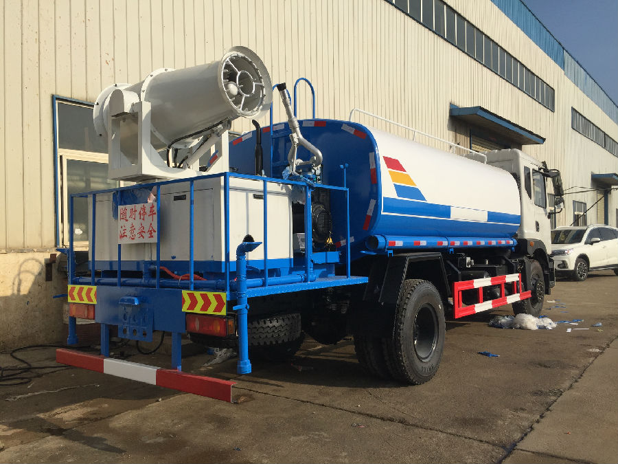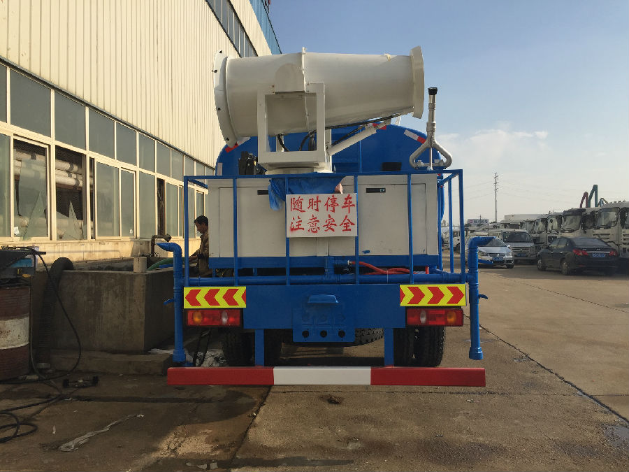 單橋可裝50-60米噴霧機車型,閃亮登場。整車型號:DLQ5180GSSL5,底盤型號EQ5180GLVJ,東風(fēng)新款T5駕駛室,4500MM軸距,國五,康機190馬力,陜齒小八檔變速箱,帶原裝ABS。前沖后灑,后工作平臺帶高炮,右位花灑,側(cè)噴。前橋5噸,后橋10噸,10.00鋼絲胎。后平臺上加裝50米霧機,水平射程50--55米,發(fā)電機組30KW,風(fēng)機電機11KW,水泵電機3KW。