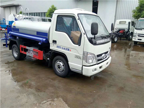福田灑水車前裝有鴨嘴形噴嘴或圓頭沖嘴,后面裝有圓柱形灑水噴嘴或蓮蓬頭噴嘴,后部有一工作平臺,裝配有水炮。后部還可裝8個(gè)噴嘴。