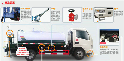 灑水車前裝有鴨嘴型噴霧或圓頭沖嘴,后面裝有圓柱形灑水砣,側(cè)噴花灑蓮花頭,車后部裝有高射噴槍。(選裝)