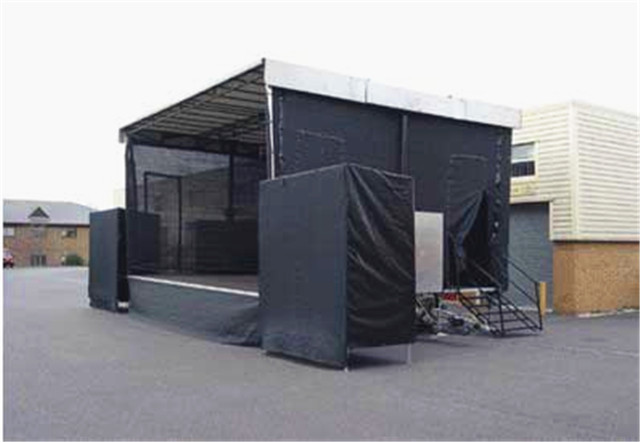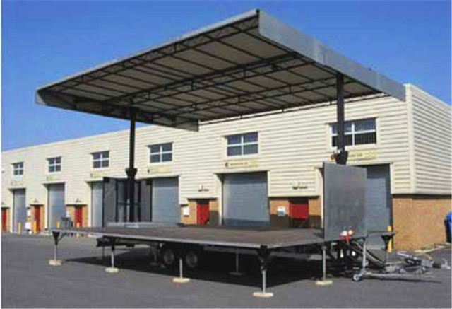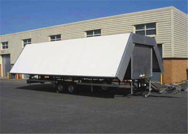 右側(cè)外板及頂板右側(cè)通過液壓舉升至與臺(tái)面垂直位置,形成遮陽、擋雨、燈光固定的頂棚及廣告的承載面。側(cè)板和頂板分別由四個(gè)液壓油缸控制展開即成舞臺(tái)的臺(tái)頂,底板也由四個(gè)液壓油缸控制,省去傳統(tǒng)搭臺(tái)程序,省時(shí)省力操作簡(jiǎn)便安全可靠。