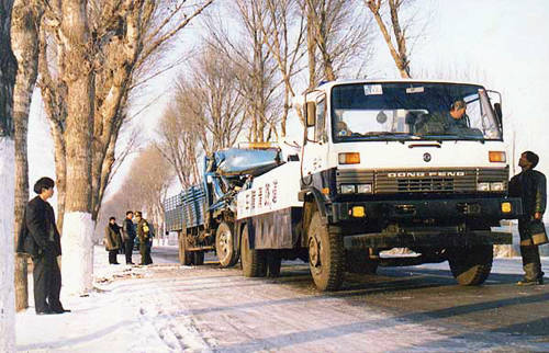 大型清障車(chē)將事故車(chē)拖走作業(yè)