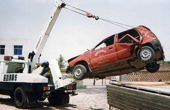 重型清障車(chē)將事故車(chē)輛吊起拖走作業(yè)圖