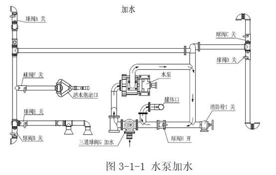 當(dāng)在野外自采水的情況下,水能通過(guò)水泵給罐內(nèi)供水,其操作程序是:在三通球閥G處接一膠管,調(diào)節(jié)三通球閥G到如圖位置(注意:三通球閥凹坑所對(duì)方向關(guān)閉),關(guān)閉不銹鋼球閥A、B、C、D、E、F和消防栓I,打開(kāi)鋁合金球閥H,踏下離合,打開(kāi)取力器開(kāi)關(guān),慢慢松開(kāi)離合(千萬(wàn)不可過(guò)快,否則將會(huì)損壞取力器或變速箱),使水泵開(kāi)始工作,即可向罐內(nèi)加水,停止工作后開(kāi)關(guān)回位。