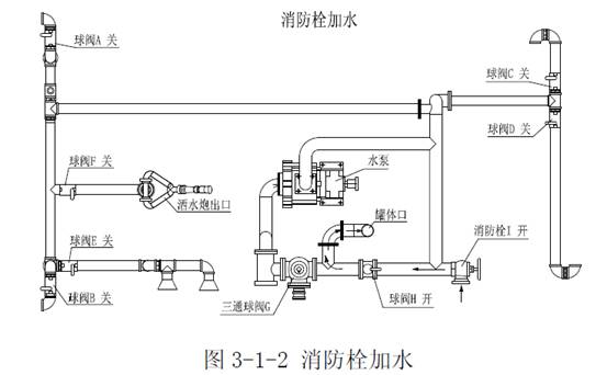 工作水路示意:水經(jīng)過(guò)消防栓開(kāi)關(guān)I、鋁合金球閥H、水罐。(其中A、B、C、D、E、F、G、H關(guān)閉)。