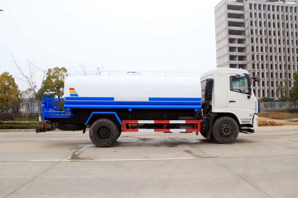 二、上裝配置: 國內(nèi)三家灑水車生產(chǎn)流水線,其中一條在我公司。罐體由國標(biāo)5mm厚優(yōu)質(zhì)碳鋼板一次性卷壓成型,二保焊行走小車自動焊接,焊縫均勻、美觀,避免了人工焊接的漏焊和虛焊,罐體內(nèi)部加固處理,并設(shè)置防浪板,罐體內(nèi)外做防銹處理,標(biāo)配前沖、后灑、側(cè)噴、后置式工作平臺,平臺帶踏梯,四周有安全護欄,平臺上設(shè)有高壓水炮,可360°旋轉(zhuǎn),可調(diào)成:直沖狀、大雨、中雨、小雨、毛毛雨。3950軸距及以上車型標(biāo)配高位花灑功能。